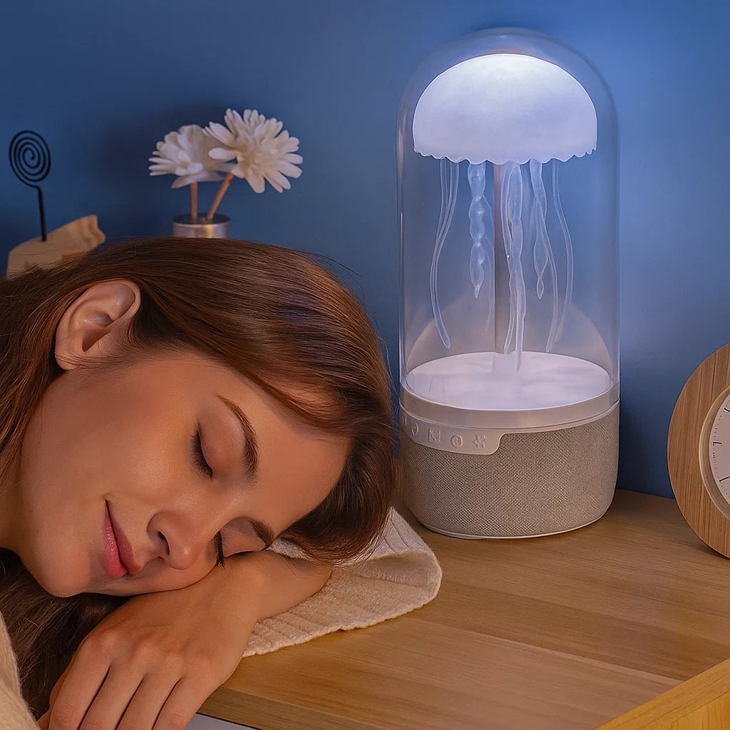 Después de un día largo frente a la pantalla 🖥️ o cumpliendo responsabilidades 🧾, mereces un espacio solo para ti. La Lámpara Medusa LED combina luz ambiental 🌟, sonidos relajantes 🎧 y diseño moderno 🐚 para ayudarte a desconectar, respirar y reconectar contigo. Transforma tu rincón favorito en tu refugio de calma y estilo 🛋️✨.
